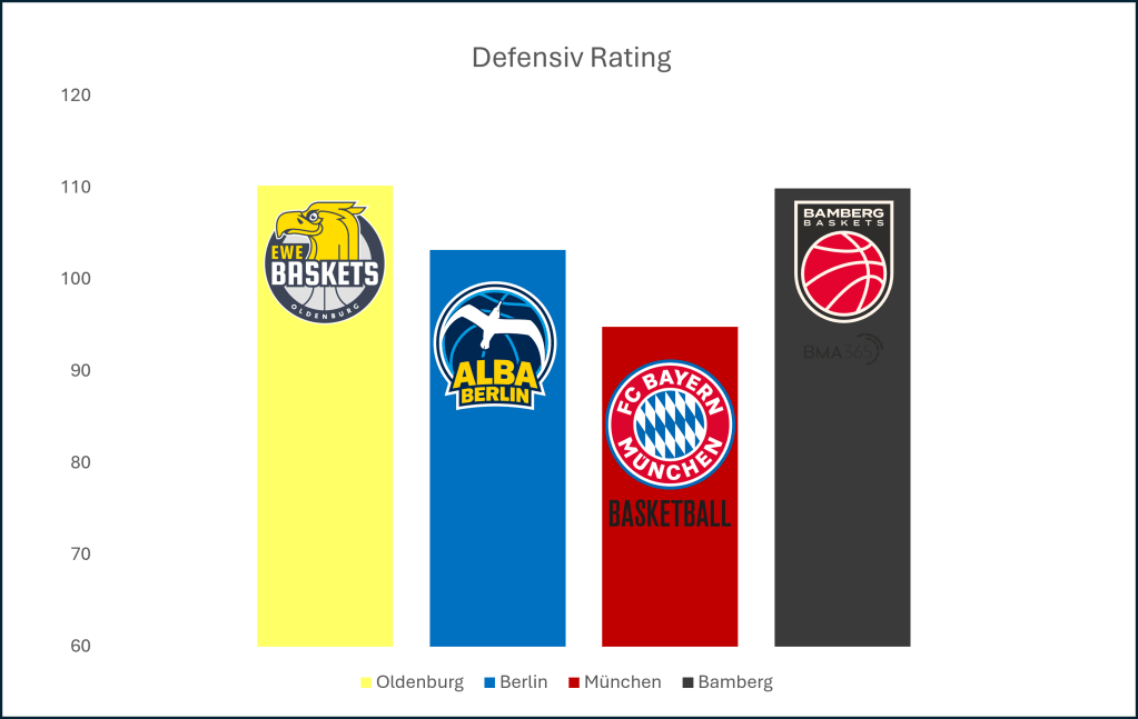 Ähnlich wie bei der Zweierquote dominiert der FC Bayern München auch in dieser Statistik das Feld. Mit einem überragenden Defensivrating von 94,8 sind die Münchener ligaweit Spitzenreiter.