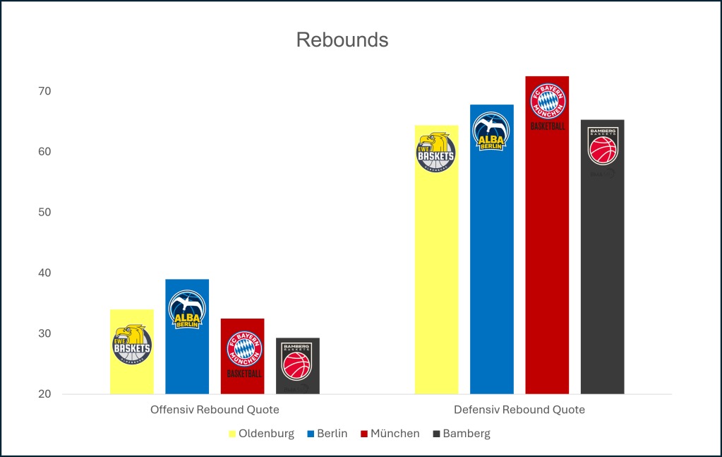 In der defensiven Reboundstatistik steht Berlin hingegen auf Rang zwei. Spitzenreiter ist der FC Bayern München mit starken 72 Prozent. Die Münchener geben damit im Schnitt nur jeden vierten möglichen Rebound in der eigenen Defensive ab.