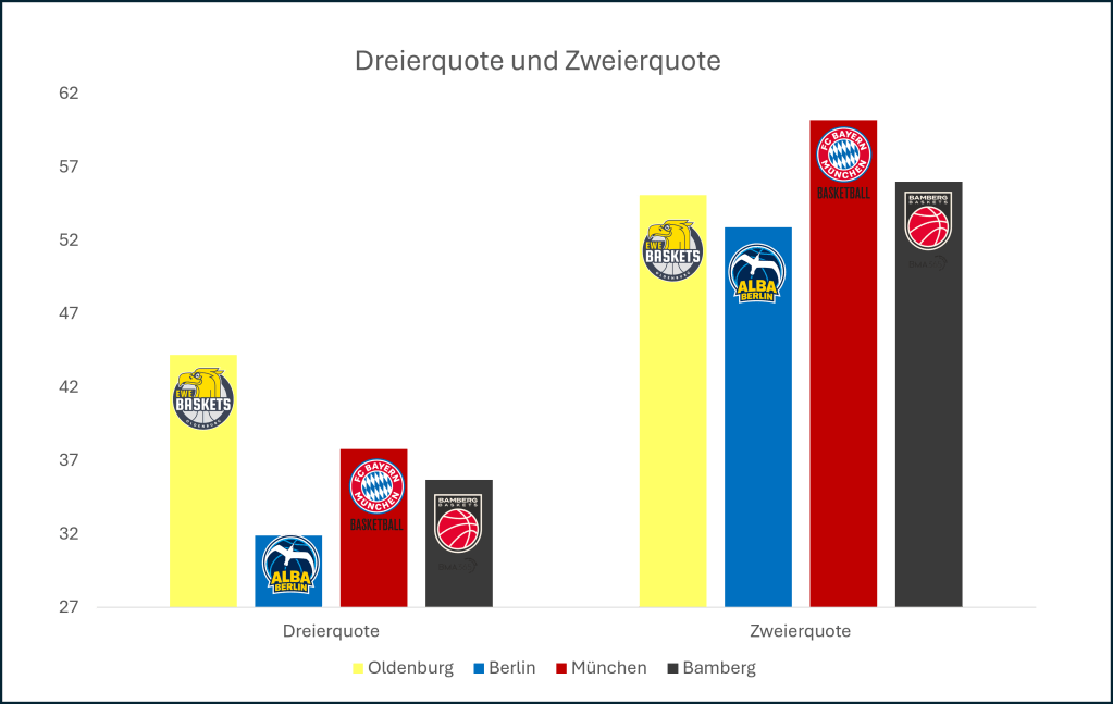 Ein Blick auf die Wurfquoten der vier Teams zeigt deutliche Unterschiede. Vor allem von der Dreierlinie stechen die EWE Baskets Oldenburg heraus, die starke 44,2 Prozent ihrer Würfe von außen verwandeln.