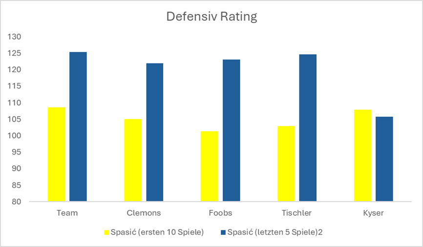 In den letzten fünf Ligaspielen zeigten die Oldenburger in dieser Hinsicht jedoch deutliche Probleme. Im Schnitt kassierten sie 91,2 Punkte bei einem Defensivrating von 125,3. Viele Spieler verschlechterten sich in diesem Zeitraum individuell im Defensivrating. So lag beispielsweise Chris Clemons zu Beginn unter Spasić noch bei starken 105,1, kommt in den letzten fünf Spielen jedoch nur noch auf 121,9. Eine ähnliche Entwicklung ist auch bei Nicho Tischler und Brian Fobbs zu beobachten.