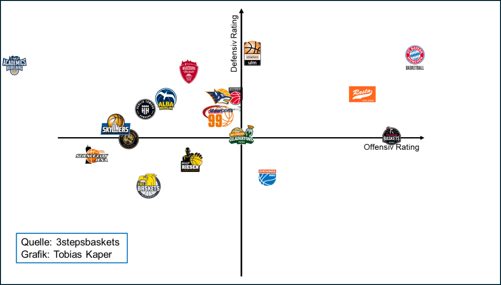Assists Wieder sind es nur 13 Assists bei 26 Treffern aus dem Feld. Die Offensive stockt aktuell spürbar, was sich auch im Offensiv-Rating der letzten beiden Spiele widerspiegelt. Gegen Frankfurt lag dieses bei 102,6, gegen Jena bei 105,6. Der Ball wird deutlich weniger bewegt, stattdessen entstehen vermehrt Eins-gegen-eins-Situationen, die die Offensive berechenbarer machen.