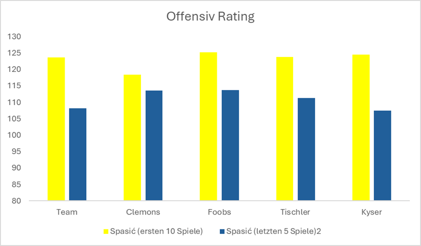 Auch in der Offensive zeigt sich ein ähnliches Bild. Während die Oldenburger in den ersten zehn Ligaspielen unter Spasic noch eine der besten Offensiven der Liga stellten mit einem Rating von 123,7, sind sie in den letzten fünf Ligaspielen mit einem Wert von 108,3 ins untere Tabellendrittel abgerutscht.