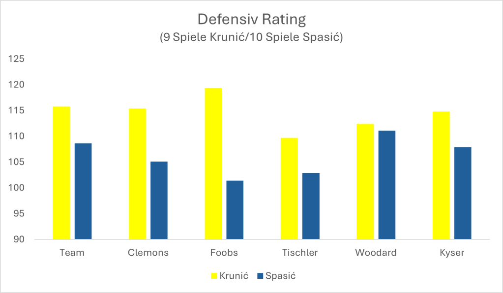 Unter Krunić hatten beide Spieler in der Defensive klare Probleme. Fobbs wies ein Defensivrating von 119,4 auf und lag damit deutlich über dem Teamwert von 115,8. Clemons bewegte sich mit 115,4 ebenfalls nur auf dem Niveau des Team-Defensivratings. Unter Spasić liegen beide Guards nun klar unter dem aktuellen Teamwert von 108,6. Fobbs kommt auf ein Defensivrating von 101,4, Clemons auf 105,1.