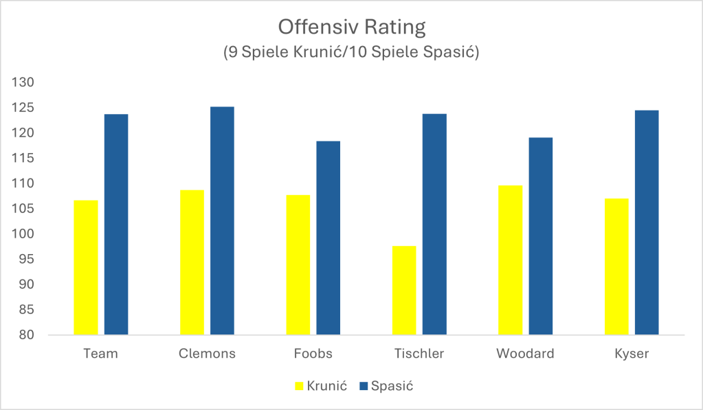 In den ersten fünf Spielen unter Trainer Spasić zeigte sich bereits ein klarer Trend. Die Offensive funktionierte unter ihm deutlich besser und das Offensivrating aller Spieler verbesserte sich, bei einigen sogar signifikant. Allerdings war die Datenbasis zu diesem Zeitpunkt noch begrenzt. Zudem fanden drei der fünf Partien gegen Mannschaften aus dem unteren Tabellendrittel statt.