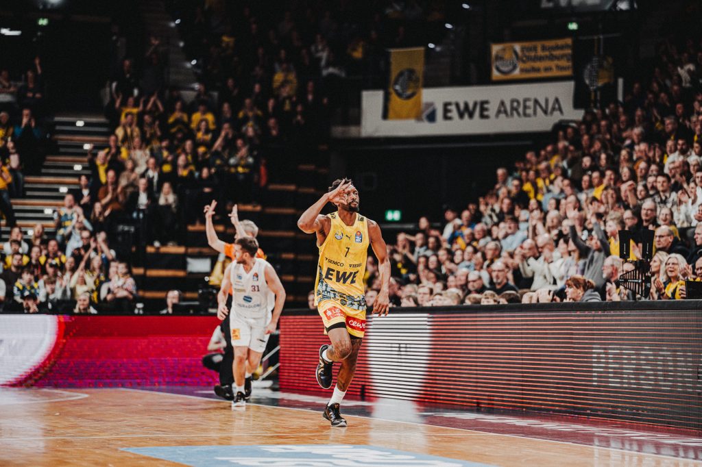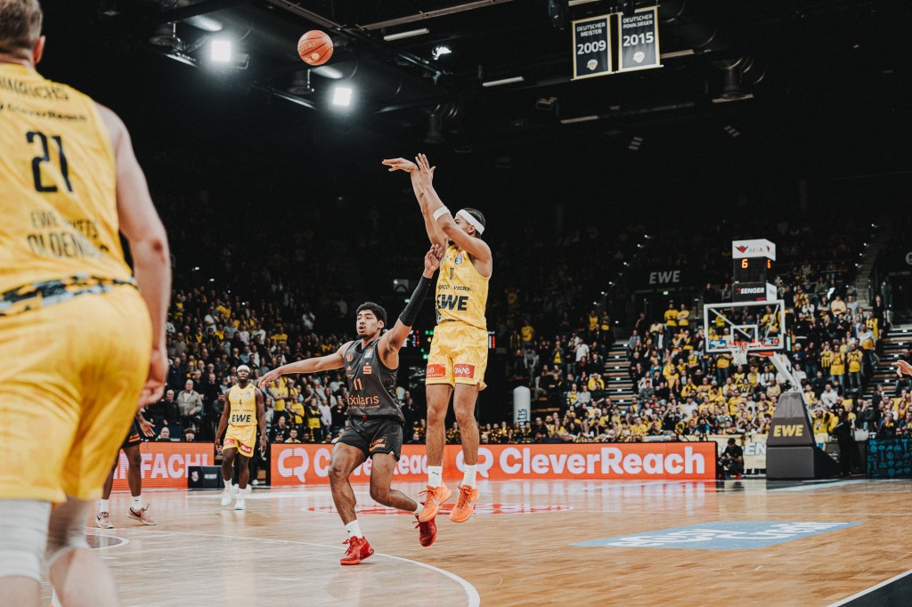 In einer Statistik sind die Oldenburger mit einigem Abstand Ligaspitze. Der Distanzwurf von der Dreierlinie fällt in dieser Saison unfassbar gut, mit 39,5 Prozent treffen sie 1,5 Prozentpunkte besser als der Zweitplatzierte, der FC Bayern Basketball, der bei 38 Prozent liegt. In den vergangenen vier Spielzeiten gab es nur eine Mannschaft, die eine bessere Quote als 39,5 Prozent von der Dreierlinie erreicht hat und das war in der Saison 2023/24 ebenfalls der FC Bayern Basketball mit Spielern wie Niels Giffey, Andreas Obst, Isaac Bonga, Sylvain Francisco oder Carsen Edwards.