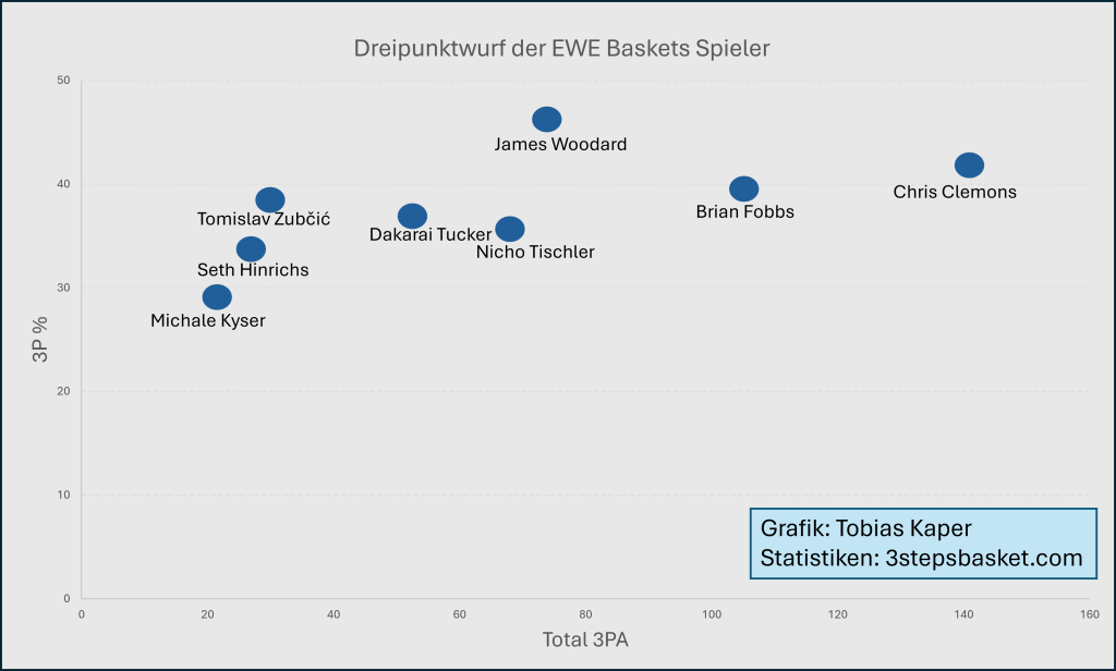 Die beste Dreierquote weist James Woodard auf. Er trifft hervorragende 45,9 Prozent bei 74 Versuchen. Von seinen 34 erfolgreichen Dreiern wurden 27 durch einen Assist vorbereitet. Clemons und Woodard sind damit definitiv besonders hervorzuheben, wenn es um die Distanzwürfe der Oldenburger geht.